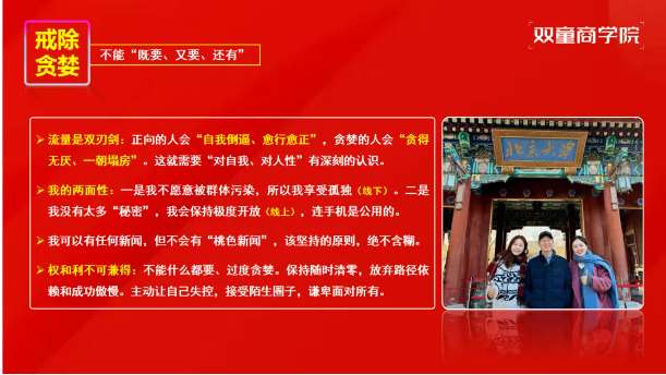 对于创业者而言,打造IP无需追求一蹴而就,纵向比较的成长心态更为重要。不必与头部网红盲目攀比,5000粉丝就能获得传统渠道难以企及的信息与机会;即便自身不擅长,也可培养员工组建团队,逐步构建企业IP矩阵。楼老师最后以思享荟学员王丽打造个人IP的案例作为结尾,点明IP打造的核心不是追求短期流量爆发,而是通过长期、真诚的价值传递,建立可持续的社会信任与商业影响力。