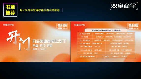 近期,双童创始人楼仲平受邀出席“更新与答案:我的2025书单”总裁读书会年终演讲系列活动,与著名企业家宁高宁同台,为参会嘉宾带来年终大课的主题分享之一《答案:阅读推动我创业成长》,结合自身创业实践经历,分享了关于管理学、经济学、哲学、自然科学等方面的阅读成长经历。