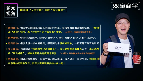 在阅读方法上,楼仲平有着自己的独到心得。他坚持 “精读与速读 10/1” 的原则,认为 “看对的书比看多书更重要”。AI 时代阅读方式不断变革,但他始终相信,阅读的核心是提炼金句、撰写书摘,把书读薄,将知识 “融入血液、嵌入语言”。