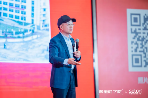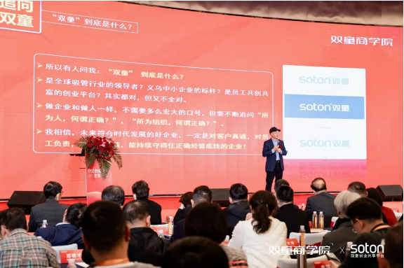 愿景,“打造共同富裕的共创平台,做有利于社会的好企业”,以创造广泛的社会价值为根本宗旨,通过构建开放包容的赋能平台,致力于促进包括物质、能力、机会在内的全方位“共同富裕”。 核心价值观,“致力成长,协同共生”,这八个字凝聚了双童的发展智慧。致力成长要求组织与个人保持持续进化;协同共生则主张在与各方关系中寻求共赢,在利他中实现可持续发展。 这三个维度的相互支撑构成了双童三十余年实践中沉淀出的经营哲学,为企业从传统制造向共享平台转型提供了根本指引,也为中小企业的可持续发展提供了可借鉴的实践路径。 楼仲平老师阐述《双童经营哲学》的核心纲要 楼仲平老师总结道,经营的终极修行存在于具体的事与问题之中,其底层逻辑正是对“何为正确”的不断探寻与实践。而“何为正确”没有终极答案,它存在于持续为社会创造价值、追求更多人幸福的每一个行动之中。 楼仲平老师对双童作出解读