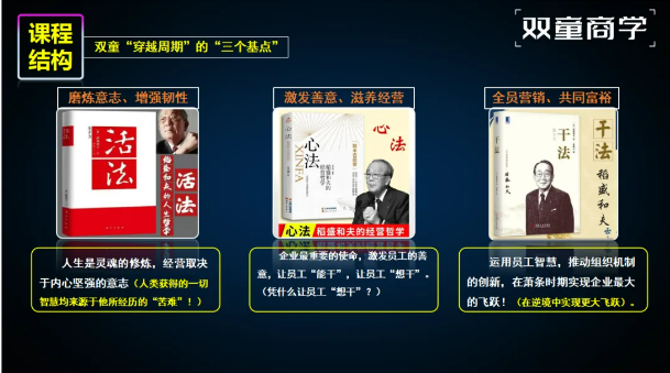 楼仲平在分享伊始,便向在座塾生们提出双童“穿越周期”的三个基点:磨炼意志、增强韧性;激发善意、滋养经营;全员营销、共同富裕。这三者相互支撑,形成了他独特的经营哲学。