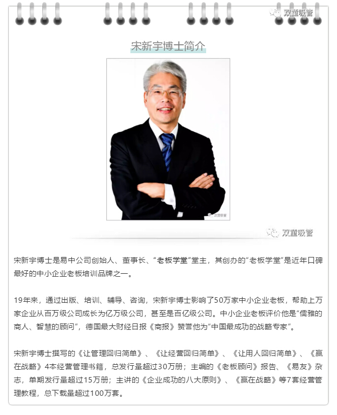其实,“双童”楼仲平与老板学堂的渊源颇深。早在2012年,楼仲平就关注到了宋新宇博士的管理理念,购买了他撰写的《让管理回归简单》,让“双童”行政人员学习。