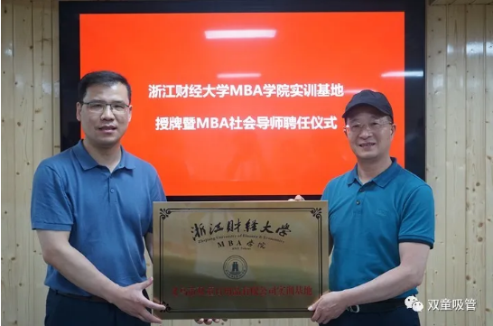 双童团队和浙江财经大学调研团合影 事实上,多年来“双童”始终积极参与产学研融合的工作,已与浙江大学、浙江师范大学、浙江理工大学和江西财经大学等多所国内高校保持密切合作关系,为校企共同发展提供资源共享平台,为高水平人才培养提供了有力支撑。 浙江大学创新创业教学实践基地牌匾 浙江师范大学MBA企业实训基地牌匾