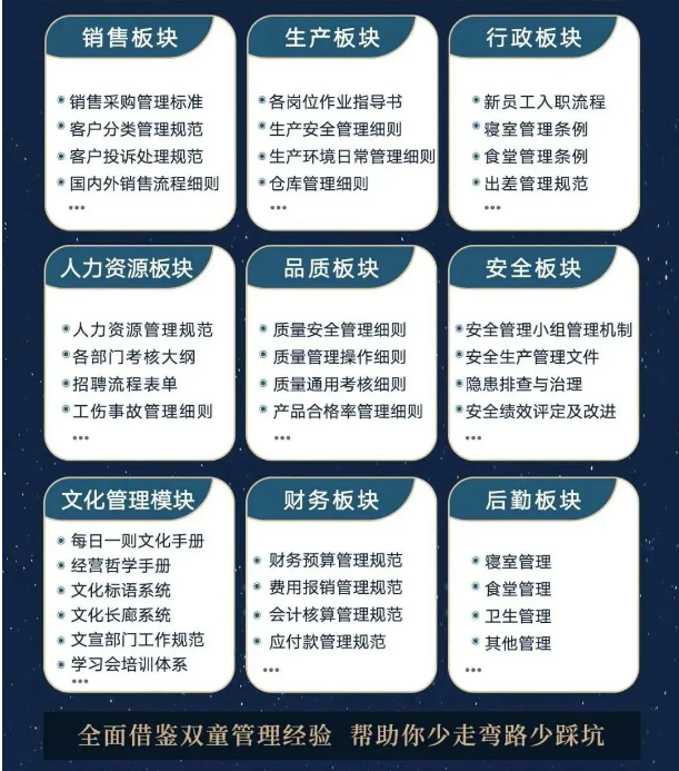所以,入学“隐形冠军楼仲平思享荟”之后,项目组会将“双童”积累了30年、包含了销售、生产、行政、人类资源、品质、安全、文化管理、财务和后勤等9大板块,近600份管理规范文件,全部打包给学员,帮助学员企业能够全面借鉴双童管理经验、少走弯路、少踩坑!