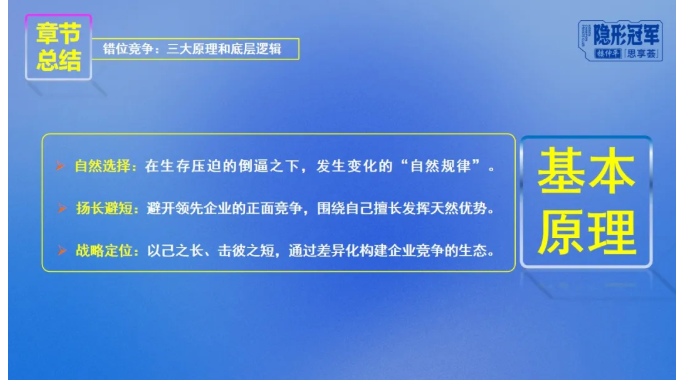 首先是底层溯源,楼老师通过引申“景区市场竞争”、义乌市场历史演变、自然界生物进化和双童《吸管传奇》等一系列案例,详细地拆解分析,让同学们从根本上掌握错位竞争的底层逻辑和三大基本原理,即自然原则、扬长避短和战略定位。