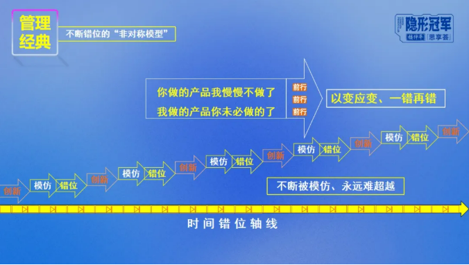 正如在商业竞争中,一个新产品诞生马上会被模仿一样,任何一种有价值的战略定位,也都会引起他人的“争相效仿”。所以,楼老师提醒同学们,再好的竞争策略也需要在发展过程中,不断错位:与主流错位、与同行错位、与自己错位、与时间错位、“一错再错”,始终在他人模仿前创新迭代,向前向前,企业才能持续领先!巨变时代下,“保持不变”是最大的敌人!