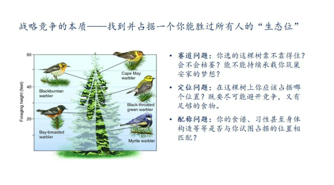 邓地博士通过引入“5种林莺在同一棵冷杉上栖息却占据不同的位置”这一生物学现象,让同学们意识到竞争的普遍性以及战略竞争的本质,就是找到并占据一个你能胜过所有人的“生态位”。