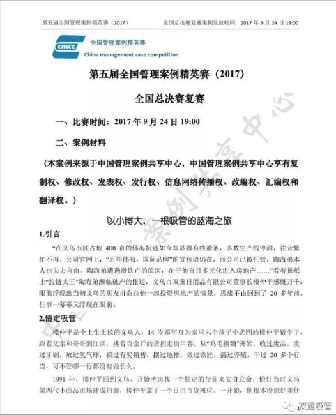 其中浙江工业大学和南京大学采编的管理案例分别被评为2016年和2017年度全国管理案例的百优案例。在2017年全国管理案例精英赛中,《以小博大,一根吸管的蓝海之旅》被指定为总决赛的PK案例。截至目前,以“双童”为主题的案例进入到国家案例库的数量已有十多件。