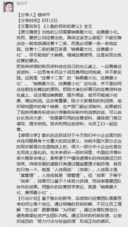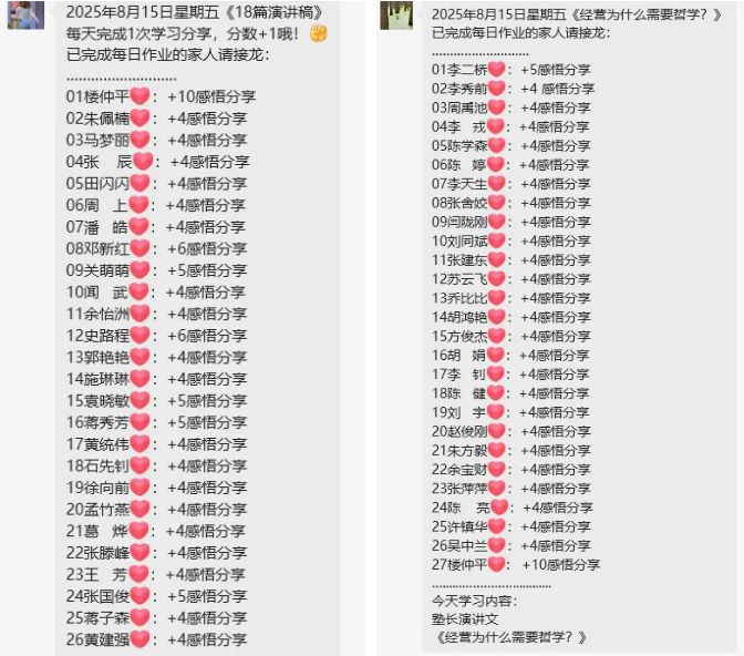 双童塾生们也积极响应楼总的号召,每天晚上学习群里热闹非凡。每个人在自己学习后,还能通过其他同修的分享来拓宽视角。许多人表示在碎片化的时间里难得有机会可以拿起书本学习,很高兴能总结过往、共同规划,一起成长。