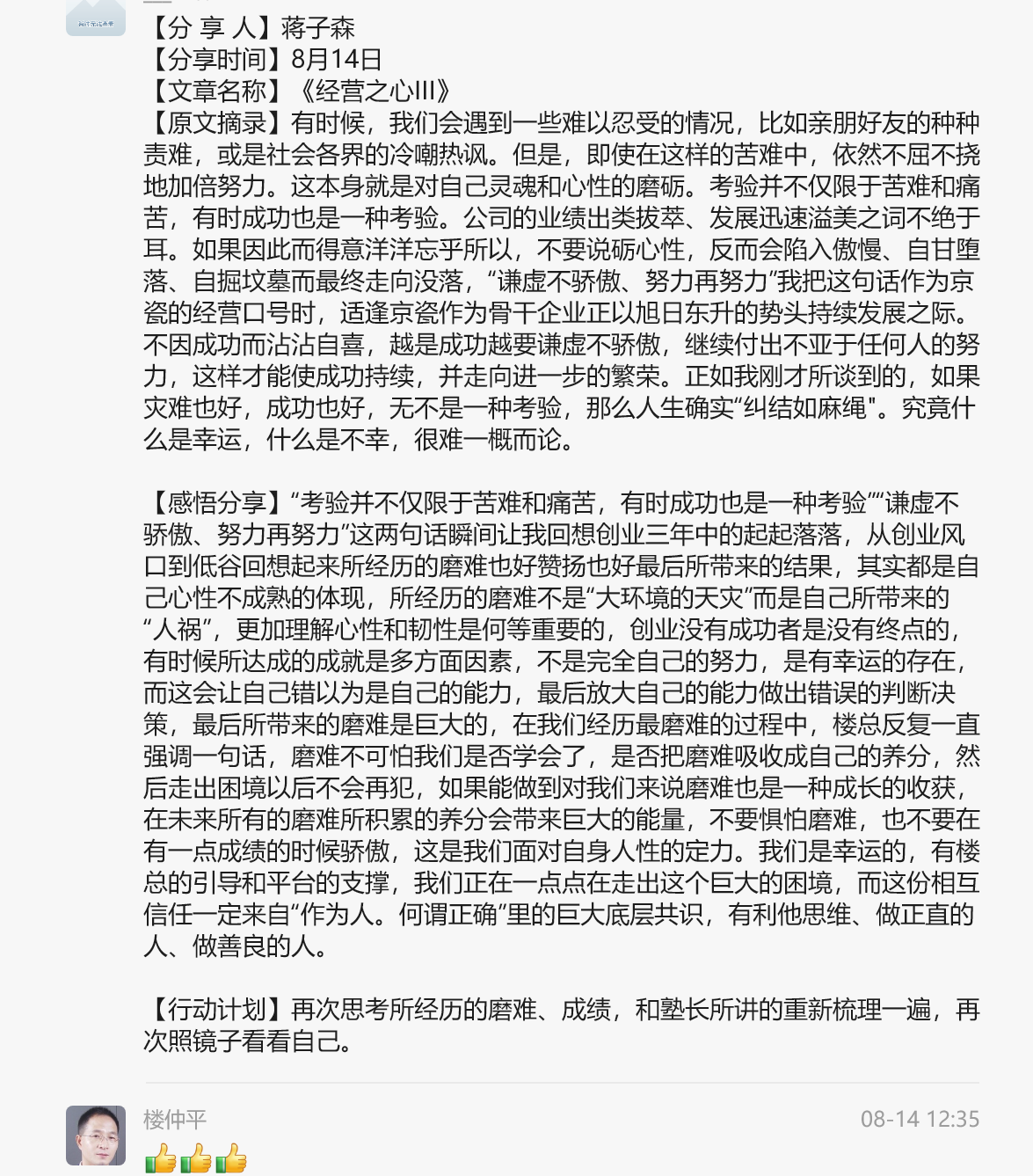 《塾生必读18篇演讲文》中将塾长的18次经典演讲进行汇编,内容包含稻盛哲学《经营之心》、《六项精进》、《经营十二条》等详细解读,双童塾生们每日阅读此书并进行学习感悟打卡。创始人楼仲平更是以身作则、率先垂范,分享他心中的稻盛哲学,以及结合所学内容发表自己最真实的反思与感悟。