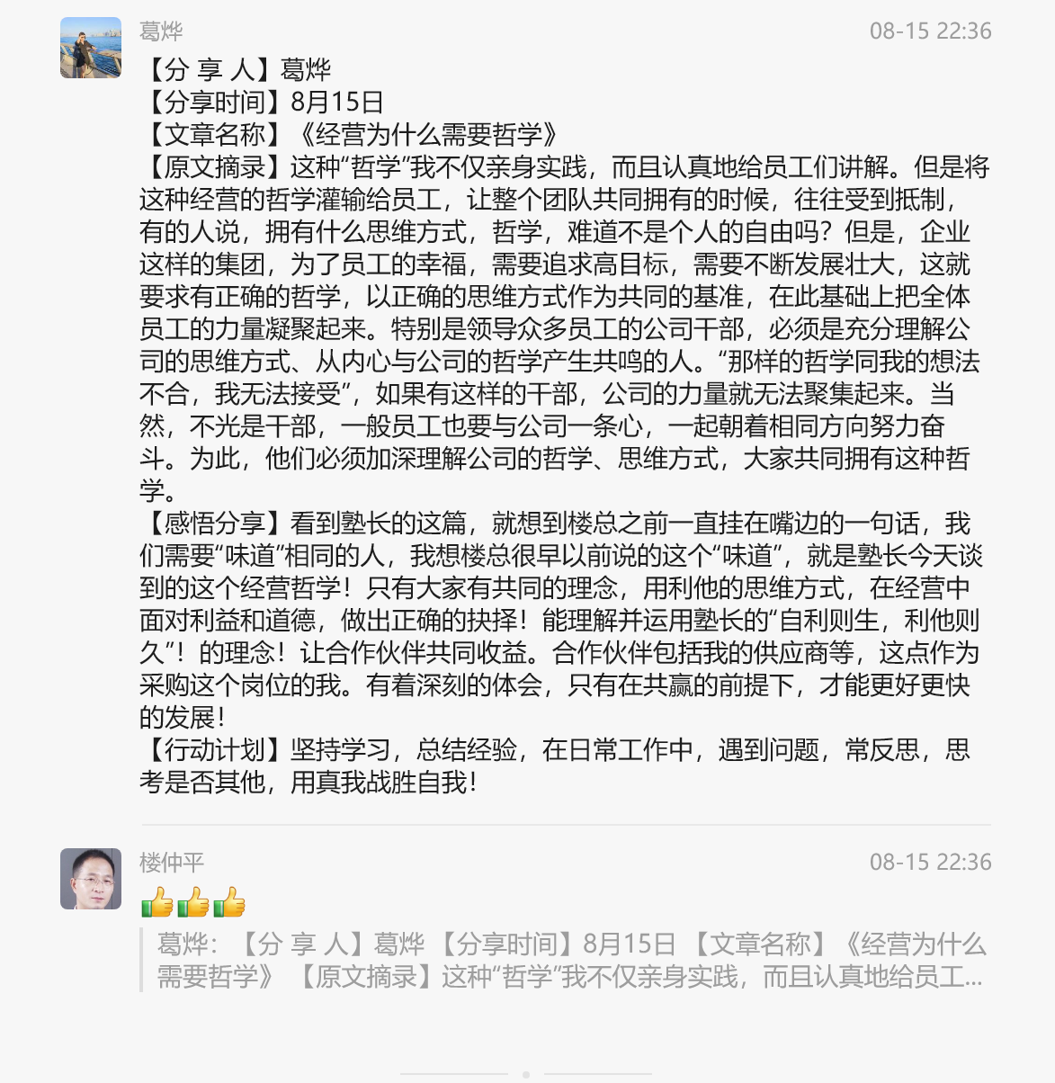 “稻盛哲学首先是我们的精神食粮,读道生的疏会接受到巨大的能量和勇气。高深哲学是我们迈向人生幸福的必需品、营养品,可以滋润我们的心,促使我们提高心性,应当成为我们的工具,每天都使用。我不仅自己要、自己读,现在还召唤我们全体进出口员工一起看,一起交流,让大家同频共振,共同进步!”