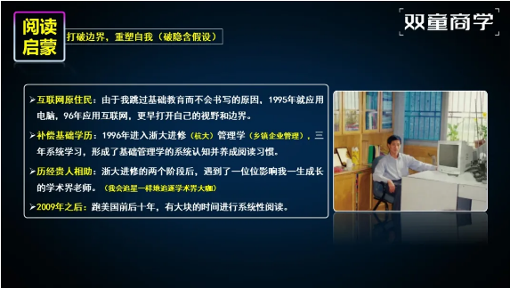尽管基础教育有所欠缺,他积极弥补知识短板:1995年启用电脑,1996年接入互联网开拓全球视野,同年进入浙江大学系统学习企业管理,构建管理认知并养成阅读习惯。此后,2009年起频繁赴美的十年间,他通过深度阅读实现了从碎片化学习到系统性思考的转变。