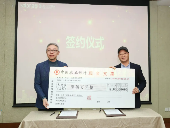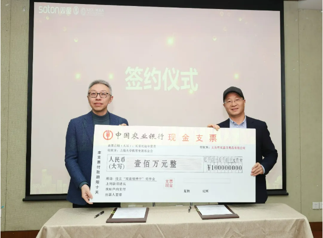 捐赠签约仪式中,双童创始人楼仲平代表双童进行首期100万的奖学金捐赠,上海大学对外联络处处长、校友会办公室主任陈方泉代表上海大学接受捐赠。值得一提的是,上海大学成为双童投身教育基金的第五所大学,是双童深耕教育、反哺社会的又一重要实践。